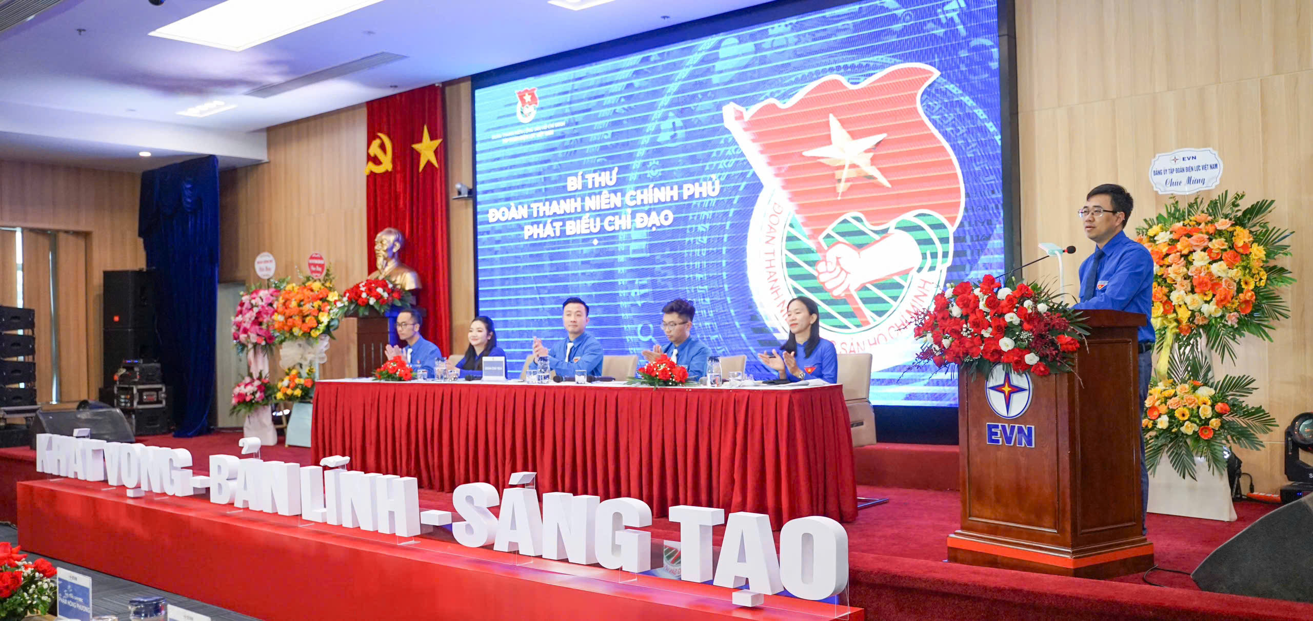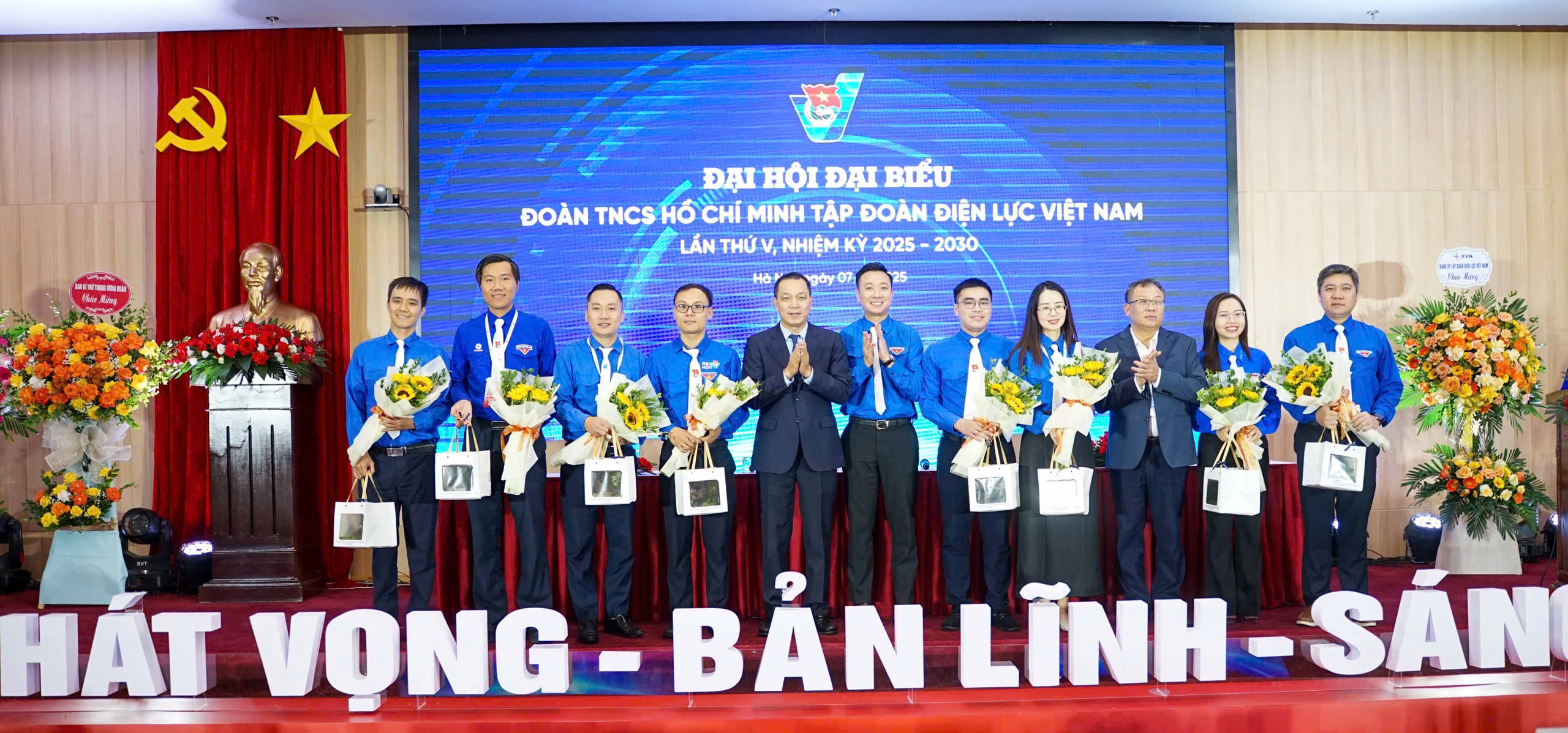 Comrade Dang Hoang An; Comrade Nguyen Tuong Lam - Secretary of Central Youth Union; Comrade Bui Hoang Tung - Secretary of Government Youth Union presenting flowers to congratulate Executive Committee of EVN Youth Union, Term V