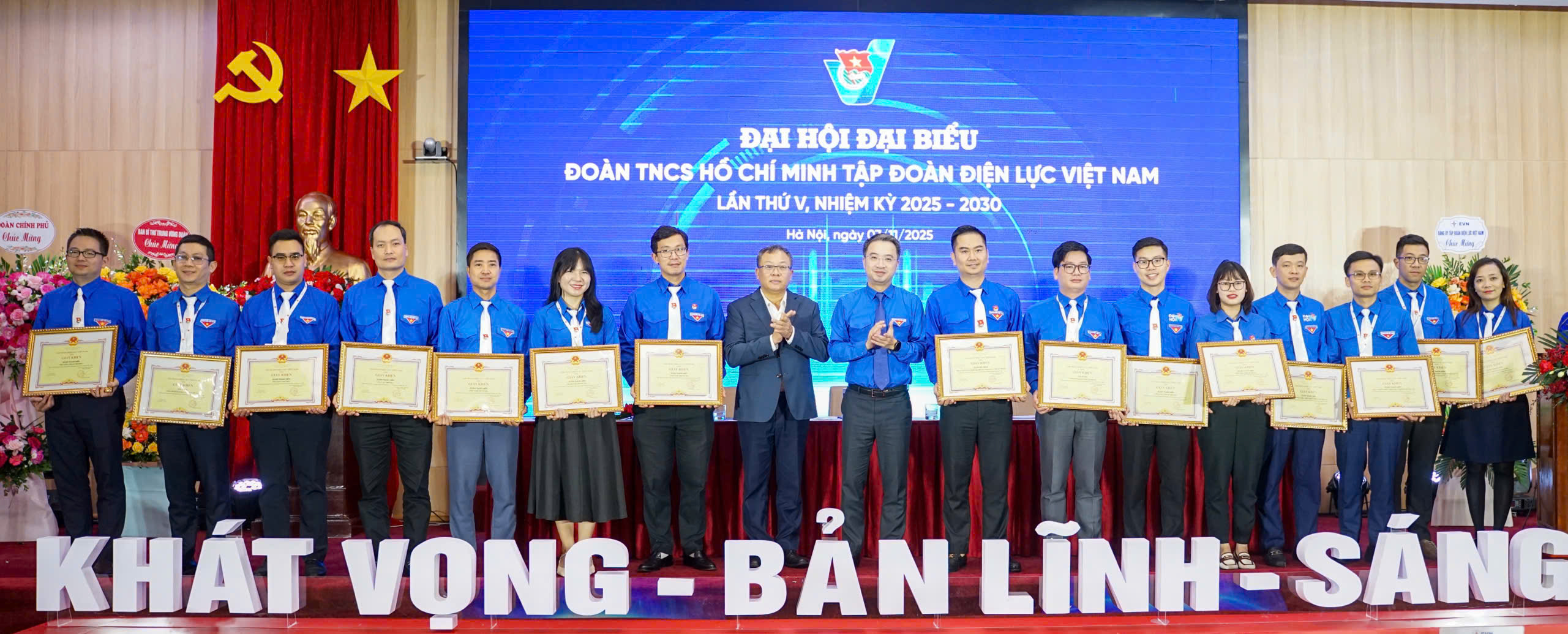 Comrade Nguyen Tuong Lam and Comrade Pham Hong Phuong presenting EVN Certificates of Merit to EVN Youth Union units with outstanding achievements in youth union work and youth movements in 2022 – 2025 period