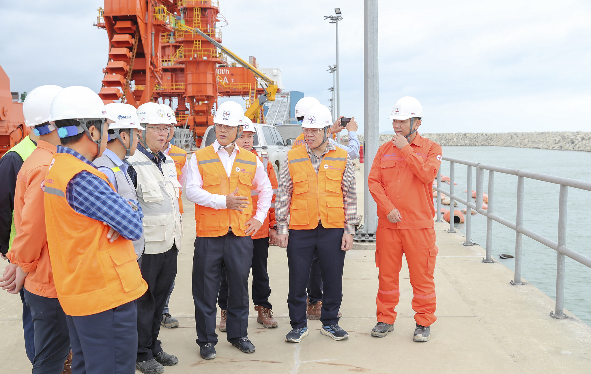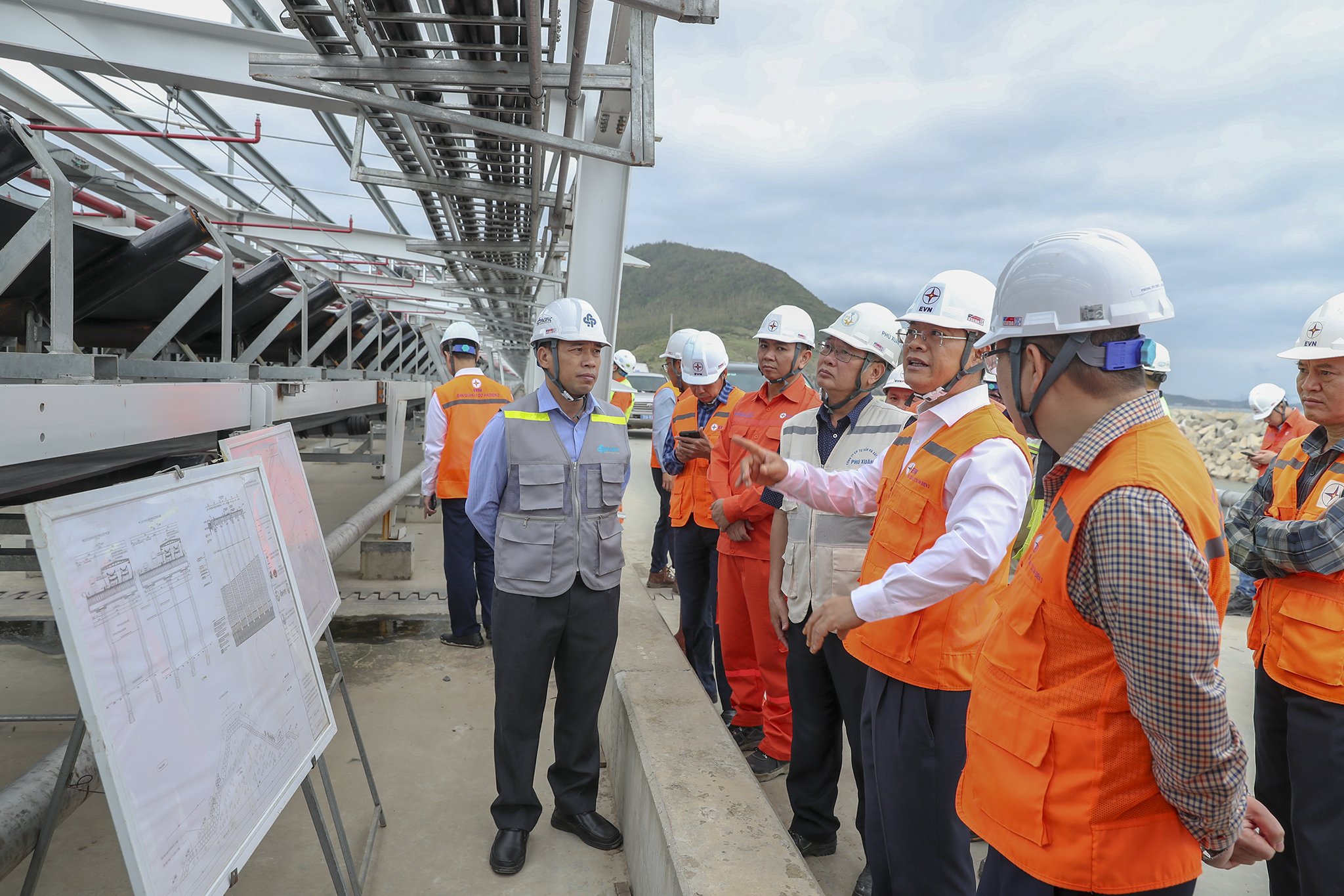 EVN leaders and working group inspecting coal import wharf area. Up to now, coal conveyor system has reached over 95% of its installed volume, expected to be tested on a single motor from November 30, 2025.