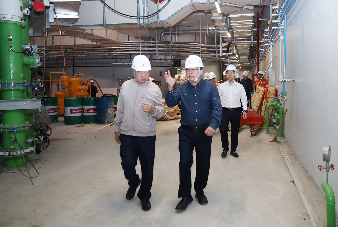 EVN Vice President Pham Hong Phuong discusses with Bui Phuong Nam, Director of Power Project Management Board No.1. EVN leadership requests completion of fire prevention and firefighting systems to ensure safe operating conditions of powerhouse.