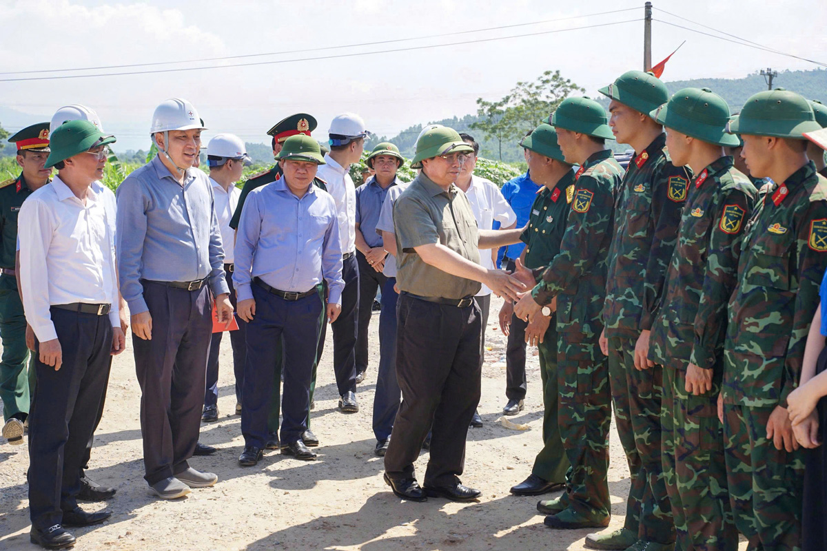 Prime Minister Pham Minh Chinh encouraging officers and soldiers of Military Region 2 to participate in project construction at location VT369