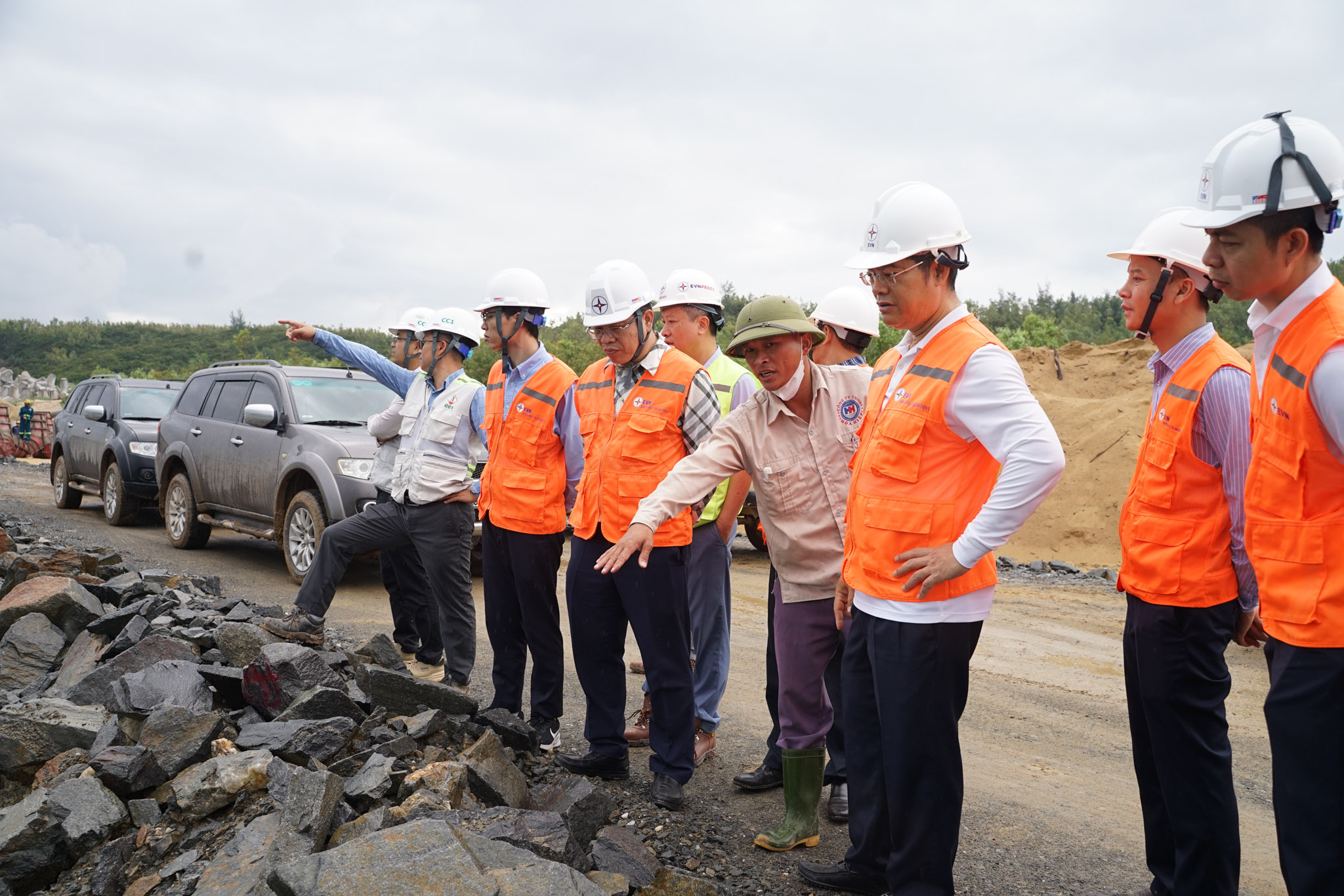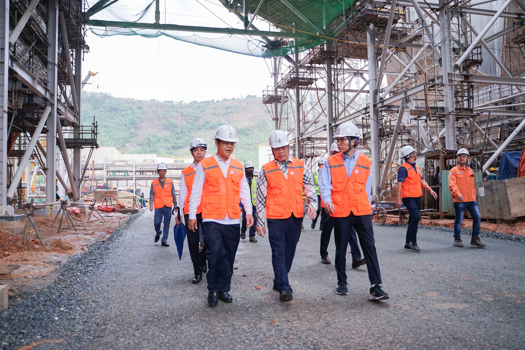 Mr. Nguyen Tai Anh - EVN Vice President (front row, far left) inspects construction site of Quang Trach 1 Thermal Power Plant project. The plant includes two coal-fired units with total capacity of 2×701.5MW.