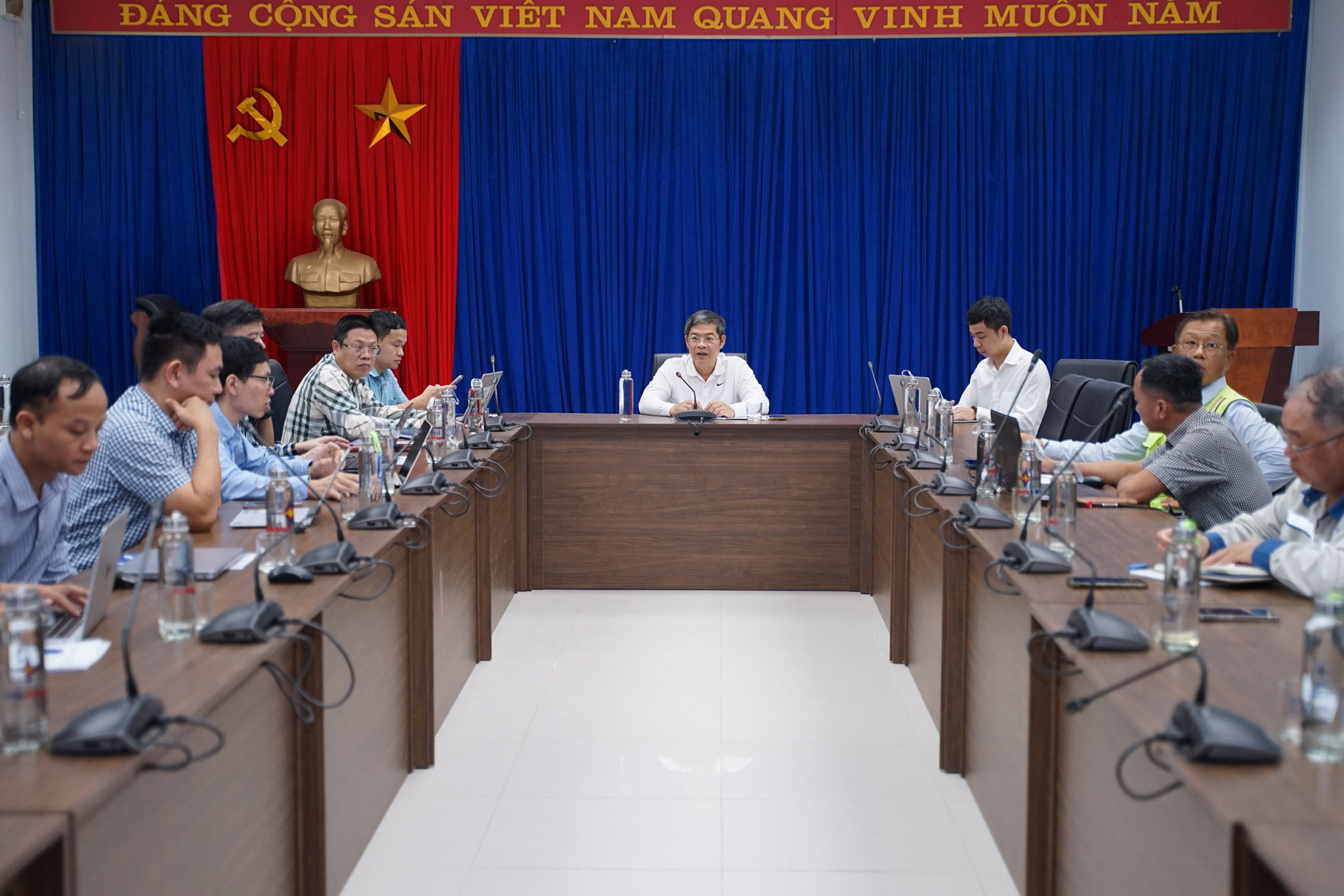 Vice President Nguyen Tai Anh and EVN delegation hold meeting with EVNPMB2 and contractors after site inspection. Quang Trach 1 Thermal Power Plant is expected to begin commercial operation of its generating units in 2026.